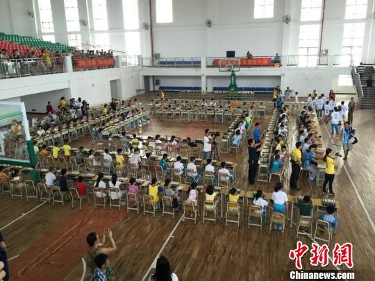 10名特级大师与围坐成一个方阵的300名小棋手进行车轮对战 王子谦 摄