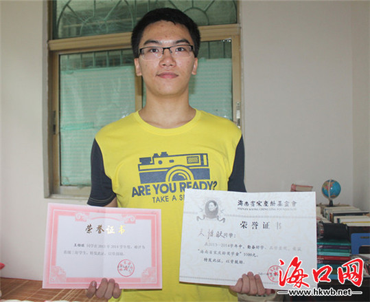 从小懂事的王怡旺知道自己是父母的希望,唯有刻苦学习才对得起父母的付出。王怡旺从书柜中拿出厚厚一摞证书、奖状如数家珍,每个学期都会获得学校或者市里的颁发的奖状,因成绩优异,2013年至2014年学年度,王怡旺被评为省三好学生,还获得了海南省宋庆龄基金会的奖励。