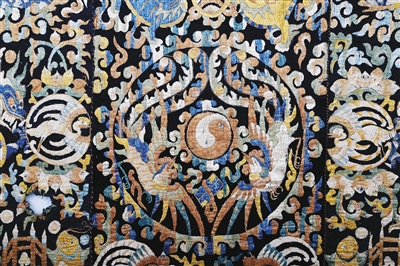 珍藏于海南省民族博物馆的这幅清双凤朝阳双狮戏球图三联幅龙被,质地为棉,通高为188公分,通宽为127公分,共由三幅组成。其底布为藏青色,整幅龙被构图饱满,色彩丰富而协调,在一片金碧辉煌中又和谐的用天蓝色和橙色交叉织绣,将冷暖色系融合得恰到好处。这幅龙被图案有双凤朝阳、双龙升天、双狮戏球、仙鹤、鲤鱼跳龙门、喜鹊登梅、花瓶、莲花、牡丹、卷草、祥云等,这些都是中国传统寓意吉祥、喜庆、平安的图案。