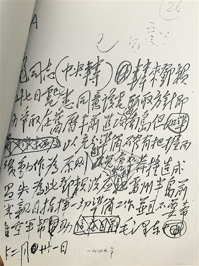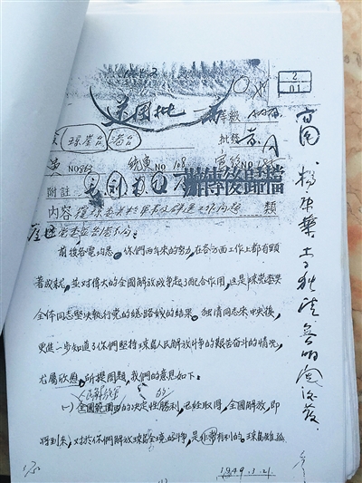 记者注意到,在解放战争时期特别是解放海南岛之前的电报往来中,绝大多数都已经采用严格的发电纸格式,其中包括“签发首长”、“发往”、“等级”、“室号”、“部号”、“机号”、“传阅”、“发后抄”等栏头,每一个项目或用机打字样,或用手写。