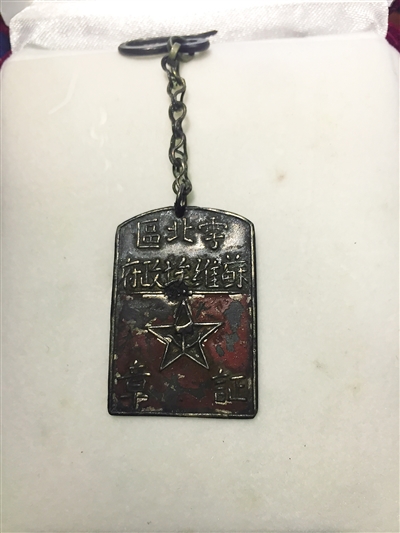 他收藏的另一枚银质方形证章,中间的五角星里刻着苏维埃的镰刀与斧头标志,上面写着雩北区苏维埃政府证章。表面的红色底漆已脱落显得斑驳。1927年“四·二五”反革命政变后,中国历史进入了土地革命战争时期,也就是十年内战时期。红军和苏维埃政权在这期间颁发的各种奖章、纪念章、证章,一定程度上反映了中国工农红军的成长历史以及中华苏维埃的发展轨迹。