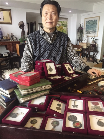 蔡于良和他的徽章藏品。