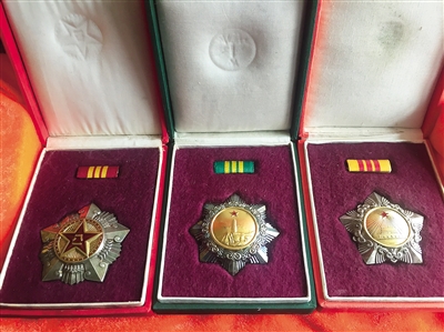 蔡于良小心翼翼地拿出一个红色锦盒,锦盒里是三个印着国徽的小盒,小盒里分别装着三枚银质勋章,上面分别写着中华人民共和国三级八一勋章、中华人民共和国三级独立自由勋章、中华人民共和国三级解放勋章,分别刻着红星和八一、红星和延安宝塔山以及红星和天安门。