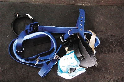 阎浩现在使用的护具是由钢筋钩子、轮滑护具和蓝色编织绳组成。他每次穿戴也不让别人帮忙,自己套上,最后靠牙齿咬着编织绳进行固定。