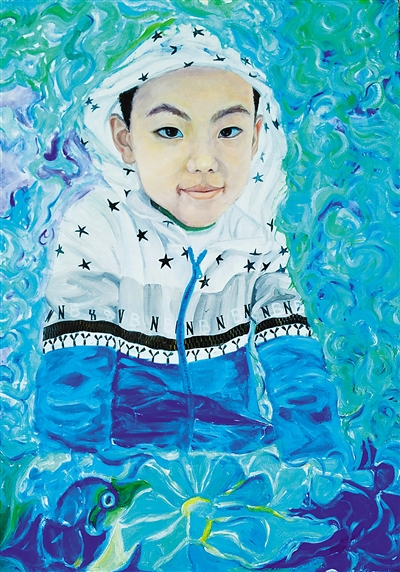 展览上,青年女画家郭旭的作品《童年畅想》感动了不少女观众。一些女性纷纷表示,看过这幅画,心里无限温暖,似是一股暖流流过心田。其实,郭旭只是画了一个小男孩的半身像,用色却很大胆,构图也颇为梦幻。更难得的是,这位小朋友在她的笔下,看起来活灵活现,整幅画面童趣盎然。