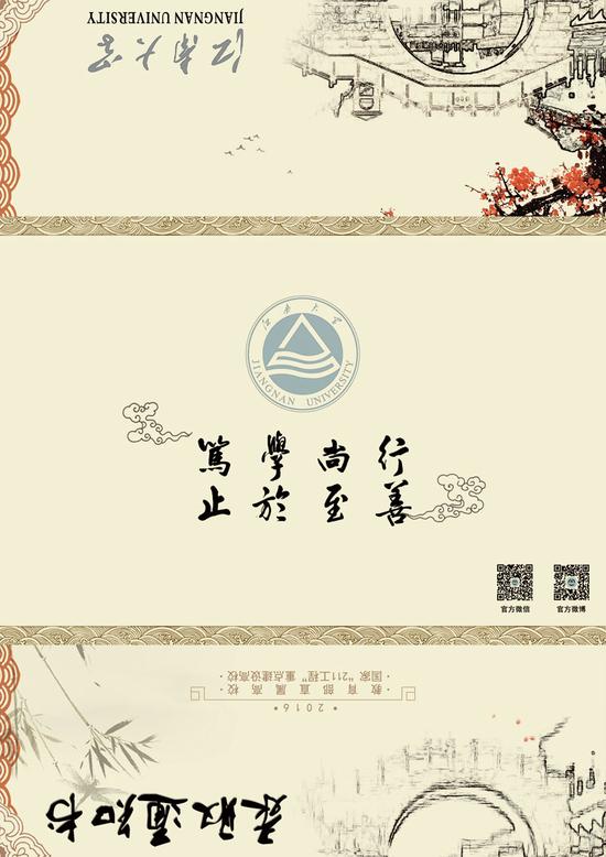 江南大学2016年录取通知书以“水墨江南”为主题,装帧折叠方式由两折改为了三折。外页图形由清名桥、墨梅等元素拼合而成;内页采用了云纹、水纹、白描图书馆、莲花、墨山等元素。通知书打开的动作与清名桥在水中的倒影巧妙结合。背面“笃学尚行,止于至善”的校训指示着入校前的学生怀揣着“书山有路勤为径”的赤子之心步入大学校园。