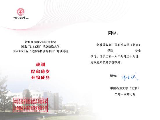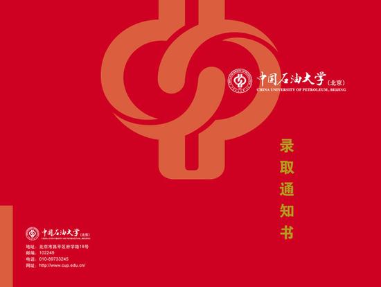 中国石油大学(北京)的录取通知书在整体上朴素庄重,以传统的折页形式呈现,分内外两侧。折页外侧以红色为主色调,浅色校标在红色中浮现,并沿着骑缝线左右对称分布,寓意石大始终以服务国家能源战略需求为己任。正面横排书写着校徽和校名,竖排书写着“录取通知书”5个金黄色字体。内页主色调为简洁明快的白色,左下方为校园标志性建筑图书馆,庄严、厚重。