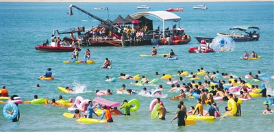 《巨齿鲨》中,巨齿鲨“误闯”热闹海滩引起上千名游客逃生的场景是全片的亮点之一。在长达6分钟的镜头中,屹立于海面上的108米南海观音像雄伟壮观,在颇具热带滨海风光的海湾,上千名游客尽情地游泳、冲浪,体验香蕉船、摩托艇等海上娱乐活动,新人乘着游艇出海举行海上婚礼,椰风海韵、礁石各异、高楼林立的城市滨海景观引人向往,中外科学家团队为了防止巨齿鲨对游客造成危害,在海上开展了一场惊险刺激的“人鲨大战”。