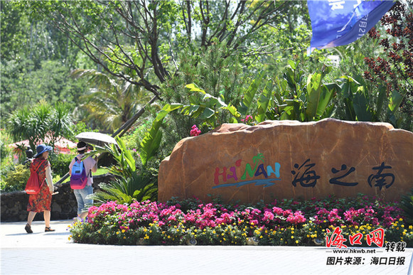 “快来,帮我拍张照!”在园区入口处正中央,一块镌刻着“海之南”3个大字的巨型黄腊石,在三角梅的掩映下显得分外醒目,吸引大批游客拍照留念。黄腊石前铺满了三角梅,两侧矗立着8个4米高的三角梅花柱和8株巍峨挺拔的热带树种银海枣。花草的芳香伴着微风徐徐吹来,沁人心脾。