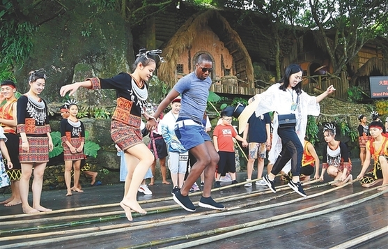 游客在海南槟榔谷黎苗文化旅游区游玩。记者 王凯 通讯员 潘达强 摄