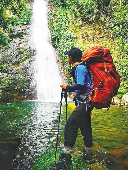 2018年,苏庆盛在海南热带雨林里徒步。
