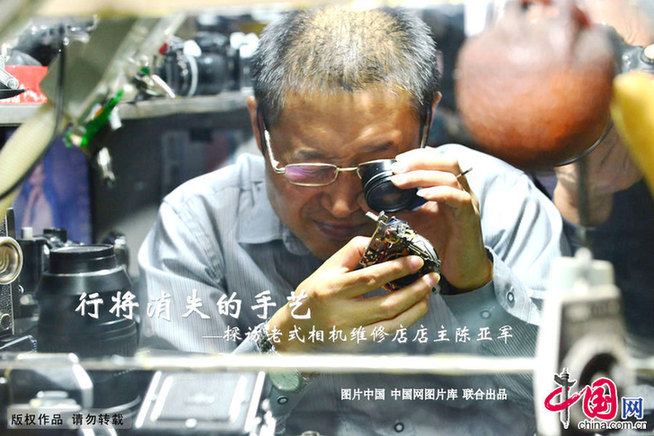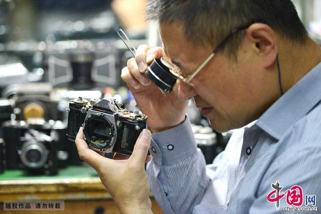 陈亚军专注的维修着一台老式相机