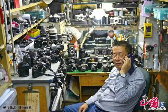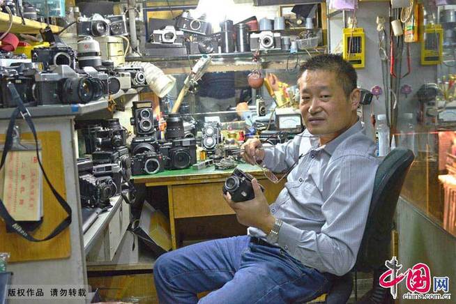 陈亚军在相机维修店展示他维修好的老式相机
