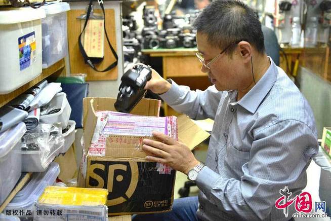 陈亚军在清理从各地寄来修理的老式照相机邮件