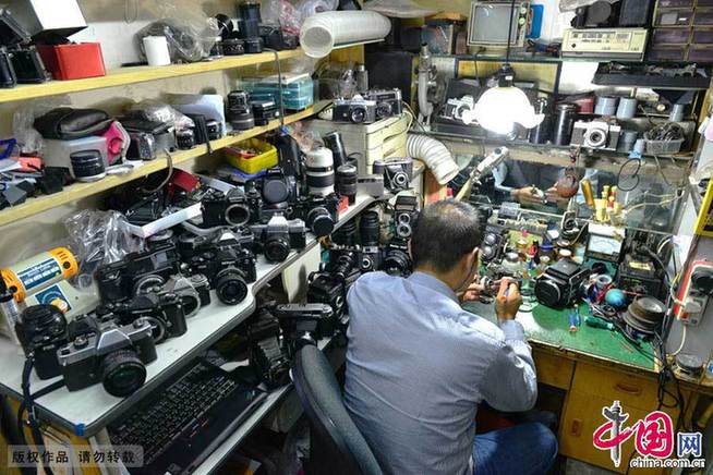 重庆沙坪坝三峡广场位于歌乐山下,作为当地的大型城市广场,这里整天都是人声鼎沸。在这个热闹广场旁一条安静的小巷里,一间不足10平方米的玻璃房间,见到了“沙龙相机维修”的店主——陈亚军。走进店内,放眼望去,架子上摆满了不同年代、不同国别的相机和各式相机零部件。