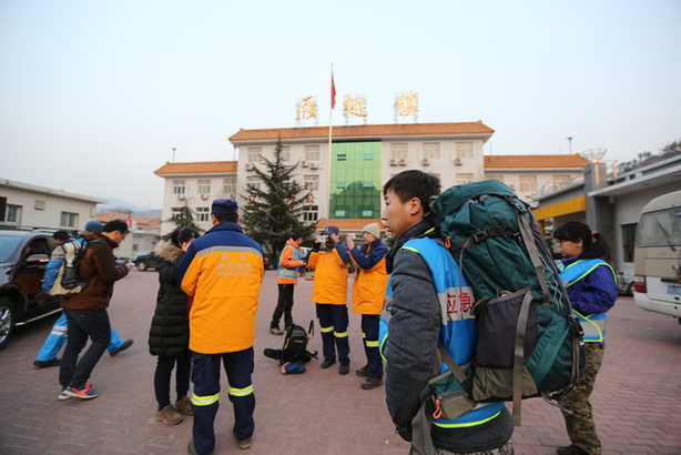 2015年2月1日消息,北京。1月31日下午,一名驴友前往门头沟登山后与家人失去联系。31日晚家属报警,并向蓝天救援队申请救援。2月1日,蓝天救援队18名救援人员仍在搜索,由于不确定失踪人员的去向,目前还没有任何发现。门头沟警方证实接到家属报警,正在进行搜寻。图为北京市门头沟区雁翅镇,救援队在镇政府大门前准备出发。