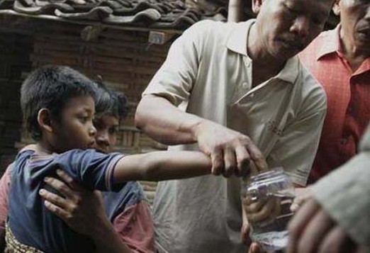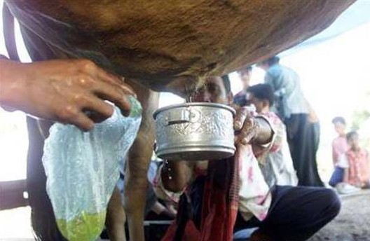 柬埔寨Kompot省,村民们收集一头牛的尿液。当地人相信牛、蛇、龟等等都有超自然的能力,尿液可治百病。