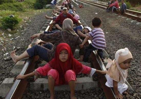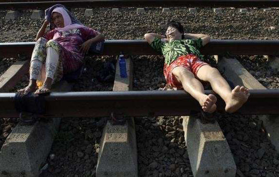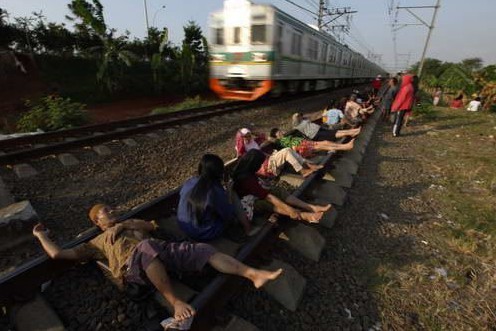 印尼雅加达,当地居民躺在铁路轨道上。部分居民每天早上和午后躺在铁路轨道上,他们相信轨道电流可以治疗多种疾病,他们将身体压在轨道上感受微小的电击。