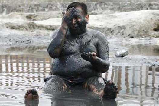 秘鲁Chilca,一名男子坐在“奇迹之湖”中进行“淤泥疗法”。“奇迹之湖”呈现与众不同的绿色,湖中淤泥据说可以治疗痤疮、风湿等各种病症。