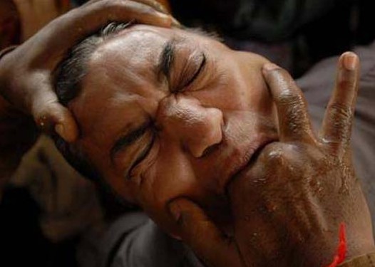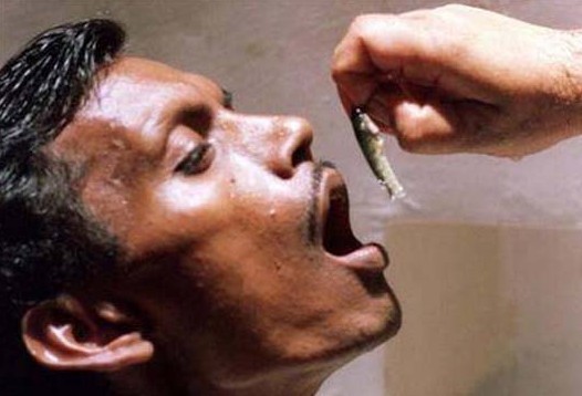 印尼人卧轨治病,再来看世界各地奇葩的治病方法,重振你的三观!印度南部城市海得拉巴,一名男子生吞活鱼以治疗哮喘和呼吸道疾病。