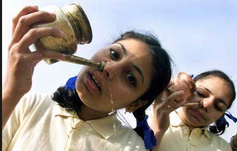 印度北部的昌迪加尔,一些印度学生在用一种特制的水壶冲洗鼻子。这种古老的习俗起源于瑜珈,据说可以治疗跟眼睛、鼻子、喉咙和大脑等有关的疾病。