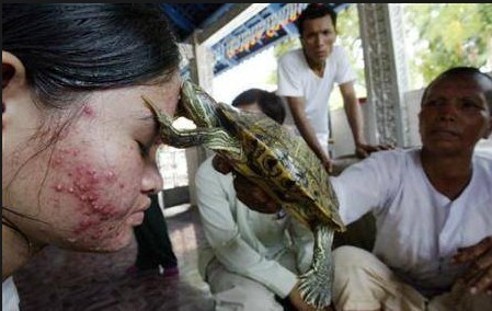 柬埔寨首都金边附近的一个村庄,一名尼姑用一只乌龟触碰一名村民的嘴唇。当地很多人认为乌龟、牛、蛇等动物有灵性,可以帮助人们治疗风湿等疾病。