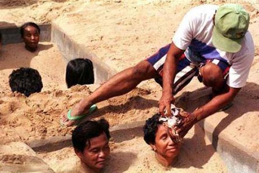 泰国武里南,一名男子为沙浴中的病人擦汗。沙浴疗法将人埋在沙子中直至脖颈处,被认为可以治疗多种病症,甚至是癌症和精神病。