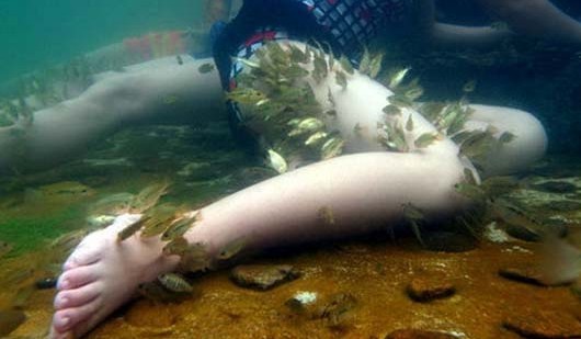 日本箱根小涌园,客人们享受温泉鱼疗。通过让小鱼吃掉脚上的死皮,可以治疗皮肤疾病。