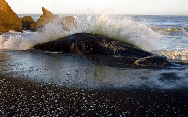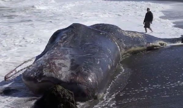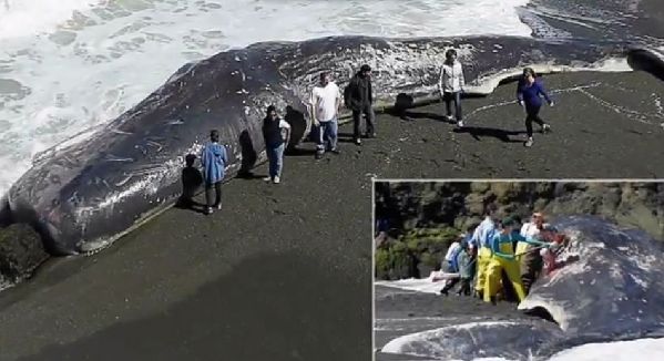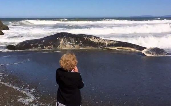 一只身长有50英尺的抹香鲸被冲上了加州海岸线,吸引了大量拿着摄像机游客们驻足观看和拍照。