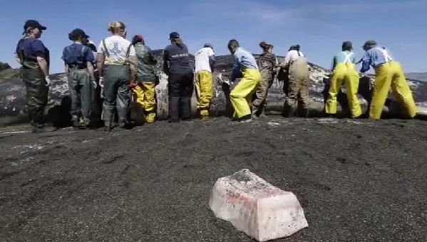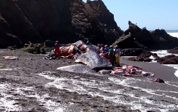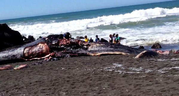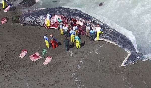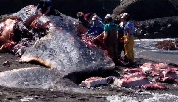 图为15米抹香鲸被冲上海岸被数人解刨。