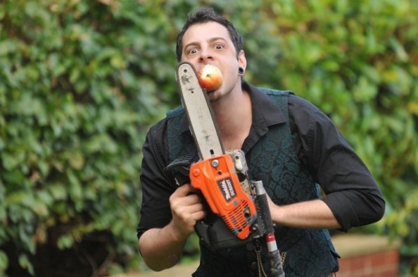 电锯哥:2013年,一个名叫约翰尼(Johnny Strange)的美国人用电锯切开咬在嘴中的苹果,他持有的纪录是在一分钟内用牙齿咬住8个苹果,然后用电锯切开。