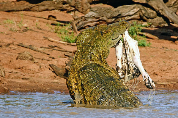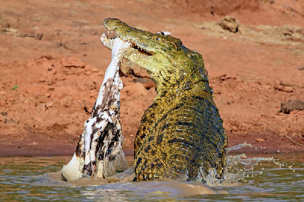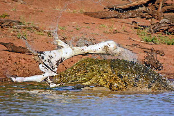 据莱斯尔回忆,这只成年鳄鱼身长4米。在出击前,它一直静静“埋伏”在河水中。待斑马慢慢靠近后,它猛地蹿出水面,张开血盆大口,紧紧咬住猎物,并向反方向甩动,撕扯下大块鲜肉。