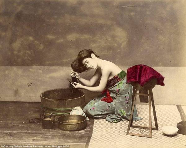 150年前,费利斯·比托(Felice Beato)为第一位拍摄远东地区的欧洲摄影师,他拍下了记录当时中日两国真实场景的照片。现代人通过电脑技术对黑白照片进行上色和修复工作,把江户时代末期、幕府统治下的日本又一次清晰地呈现在我们眼前。图为1865年,一名美丽的日本妇人在清洗自己头发。
