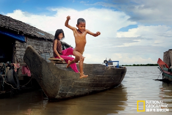 柬埔寨的湖区贫民窟的孩子在自己的船上。