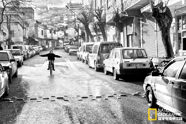 土耳其尚勒乌尔法叙利亚难民生活区中脱把骑车的孩子。