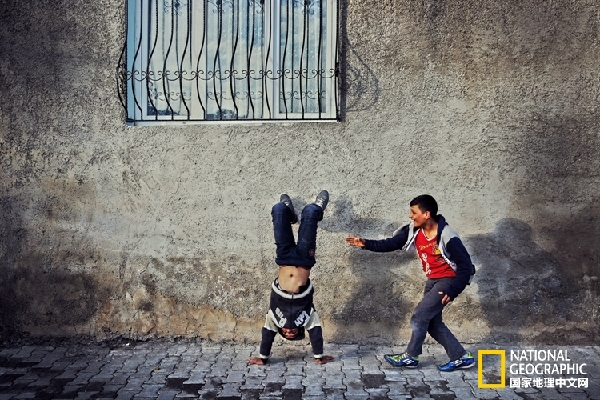 土耳其尚勒乌尔法叙利亚难民区倒立的孩子,他们的偶像是成龙。