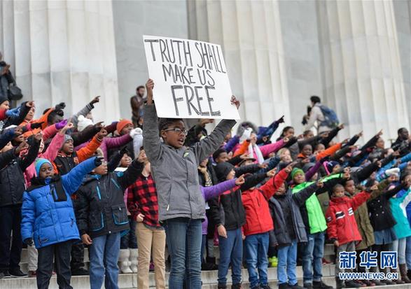1月15日,在美国首都华盛顿,沃特金斯小学的学生在林肯纪念堂前背诵马丁·路德·金的著名演说《我有一个梦想》,迎接即将到来的马丁·路德·金纪念日。马丁·路德·金是上世纪五六十年代为美国黑人争取平等权利的民权运动领袖。美国政府从1986年起,将每年1月的第三个星期一定为马丁·路德·金全国纪念日。新华社记者鲍丹丹摄