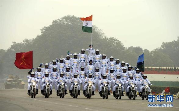 1月15日,在印度新德里,印度部队在阅兵式上展示摩托车行进技巧。当日是印度建军68周年纪念日,印度军队举行阅兵仪式进行庆祝。新华社发
