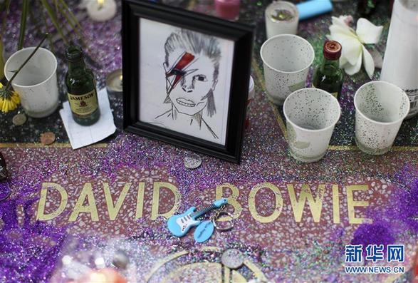 1月11日,在美国洛杉矶,歌迷将纪念物品摆放在好莱坞星光大道的大卫·鲍伊星旁。英国传奇歌手大卫·鲍伊与病魔抗争18个月后于英国当地时间1月10日病逝,享年69岁。新华社发(赵汉荣摄)