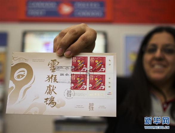 1月11日,在加拿大多伦多一家邮局,工作人员展示当日发行的猴年生肖国内版邮资邮票。为迎接中国农历丙申猴年,加拿大邮政公司11日开始发行猴年生肖国内版邮资邮票、纪念封和小全张等邮品,随后还将于2月1日发行猴年生肖国际版邮资邮票。加拿大邮政公司于1997年开始发行中国生肖邮票。新华社发(邹峥摄)