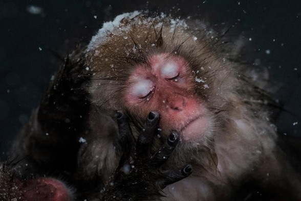 当地时间2016年1月18日,日本长野县山之内町,雪猴在地狱谷野猿公苑中泡温泉。