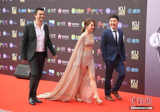 3月29日,香港女歌手邓紫棋着薄纱蝉翼性感亮相在广州举行的2016酷音乐亚洲盛典,带来经典粤语歌曲《喜欢你》。韩国歌手黄致列夺得“年度最具实力歌手”奖。许青青摄