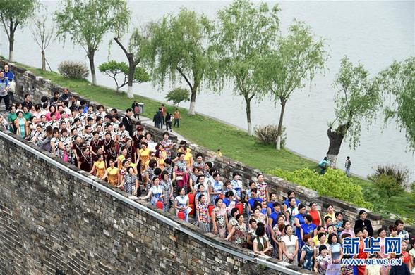 4月17日,旗袍秀队伍在明城墙上巡游展示。当日,江苏南京举行“百人城墙旗袍秀”活动,由150多人组成的旗袍走秀队伍在玄武湖畔的明城墙上巡游、表演。此次城墙旗袍秀是第二届南京网友节组织的一场文化主题活动。新华社记者孙参摄