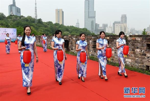 4月17日,参加旗袍秀活动的市民在明城墙上表演。当日,江苏南京举行“百人城墙旗袍秀”活动,由150多人组成的旗袍走秀队伍在玄武湖畔的明城墙上巡游、表演。此次城墙旗袍秀是第二届南京网友节组织的一场文化主题活动。新华社记者孙参摄