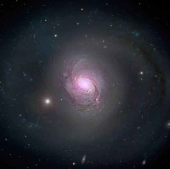 图为NGC 1068螺旋星系,位于鲸鱼座,距离地球4700万光年。这是由美国宇航局的核光谱望远镜阵列拍摄到的,展示出了可见光与X射线。X射线来自星系中央一个活跃的超大质量黑洞。超大质量黑洞较为模糊,被厚厚的云层的气体和尘埃所覆盖。(图片来源:NASA)