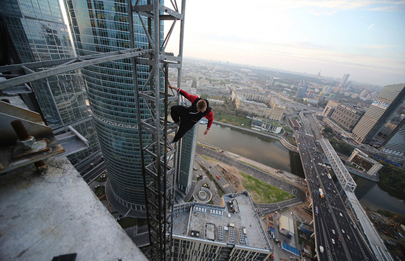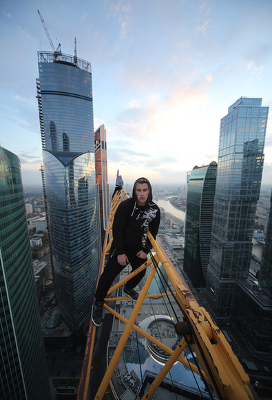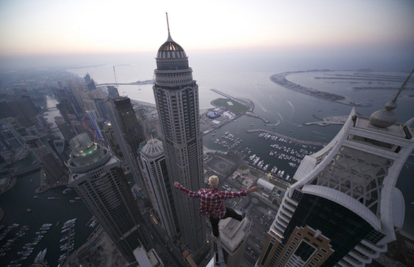 照片中,职业跑酷运动员阿布迪正在迪拜世界贸易中心大楼顶上自拍;俄罗斯跑酷高手奥列格(Oleg Sherstyachenko)正坐在迪拜第二高建筑——1394英尺(约425米)高的马里纳101大楼顶上俯瞰迪拜夜景。在红牛电视发布会上,奥列格表示,他想感受“恐惧”是什么感觉,而这张照片只是他的一个尝试。