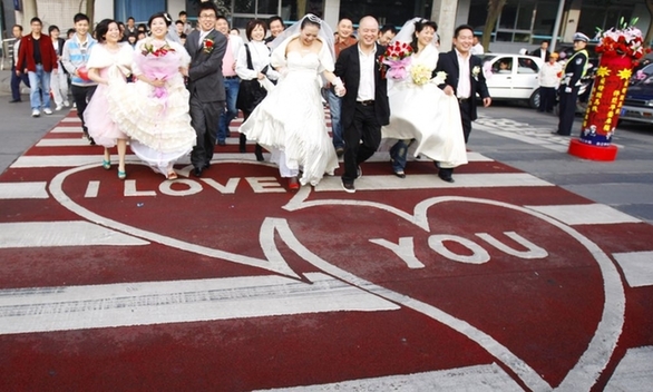 中国成都,新婚夫妇走过“爱情斑马线”。