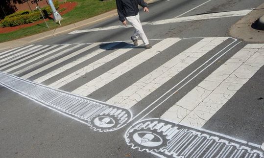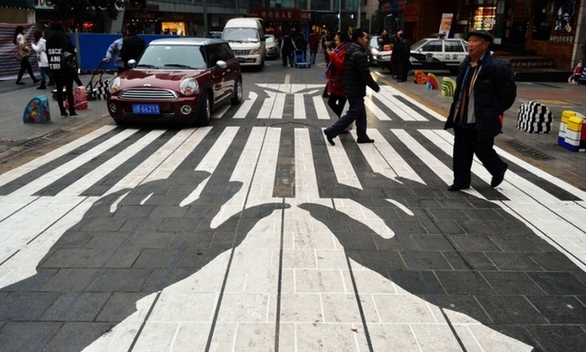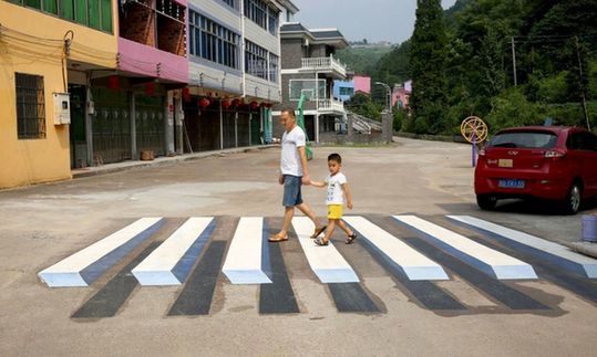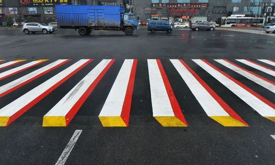 中国长沙,3D效果的斑马线有助于提升司机的注意力,提高道路安全性。