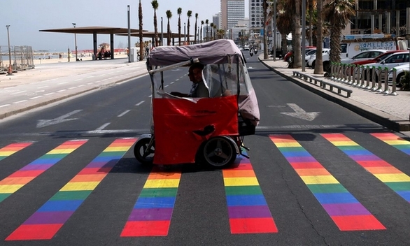 以色列特拉维夫,在同性恋大游行前夕,人们穿过彩色的行人通道。