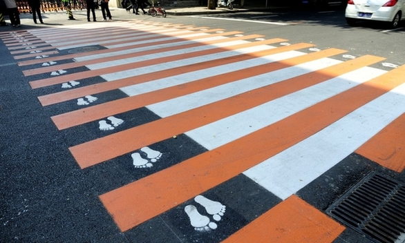 中国沈阳,人行横道装饰着脚印图案。